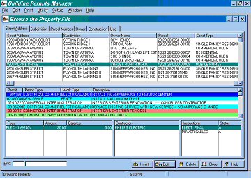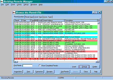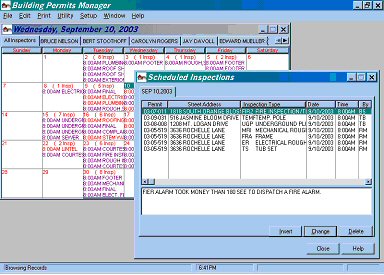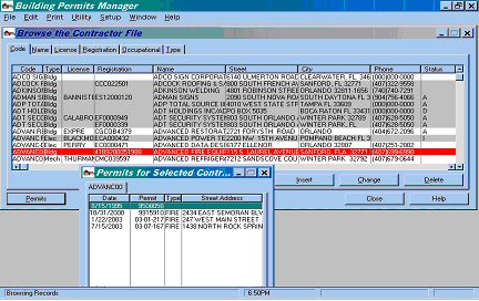 The program keeps track of scheduled inspections for each day, and maintains a history of inspections. By simply selecting a permit type all fees, a user designed permit form, and inspections required are inserted onto the permit for you. Building Permits Manager will keep track of contractor license expirations, and warn the user of expired information when the contractor is selected to add to a permit.